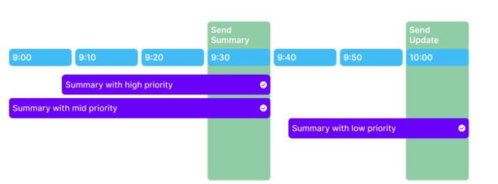 The creation of summaries relies on the data available at the time of calculation. Initially, a summary is formed using the first data source received. This summary is then enhanced with extra data from other sources. Once the initial summary is dispatched, there is a 15-minute interval before an updated summary, incorporating any new data, is sent. These subsequent summaries are marked as updated versions.