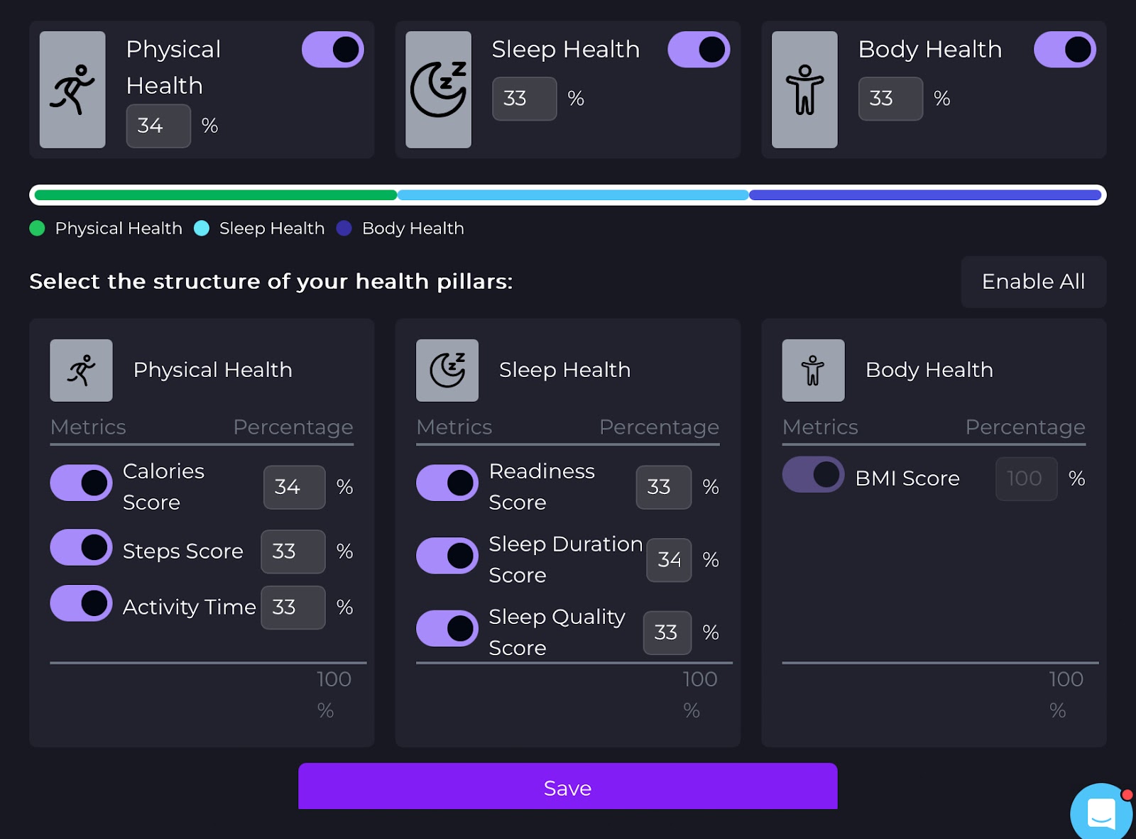 Adjust the weight of each health pillar, ensuring that the combined total equals 100%.