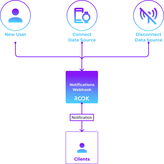The Notification Webhook add-on enables ROOK to send real-time notifications to clients regarding actions within their integration with us. This feature includes notifications for new user creation, connection or disconnection of data sources, failed notifications to user data sources, and undelivered information alerts. Our aim is to provide clients with timely updates without the need for API queries, leveraging webhooks for automatic notifications. This enhancement ensures that clients receive up-to-date information, streamlining their workflows and improving efficiency. This add-on is available upon request. To access it, contact your account manager.