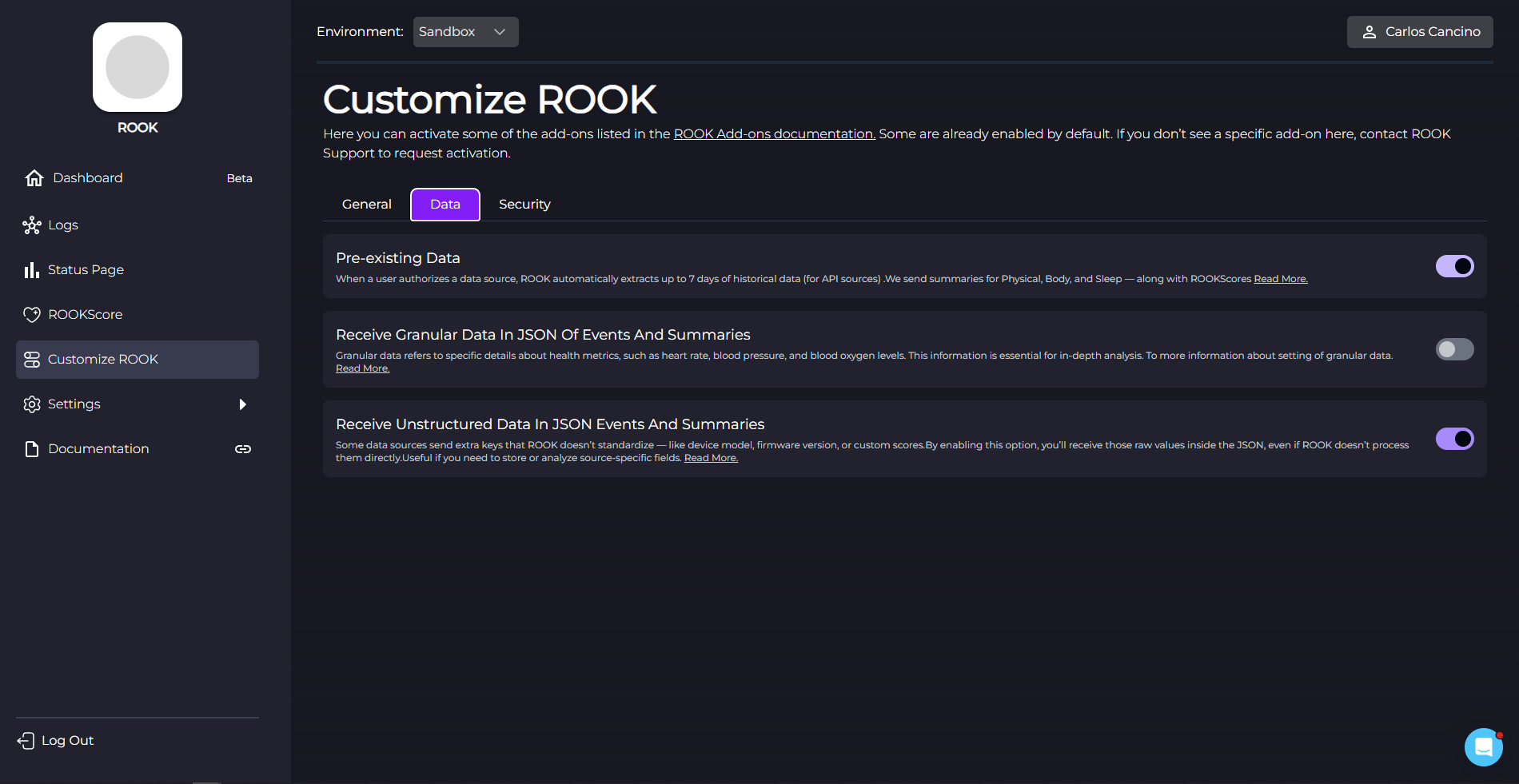 Navigate to the Customize ROOK Module: Locate and access the "Customize ROOK" module within your account dashboard. This module provides the option to activate Pre-existing Data.