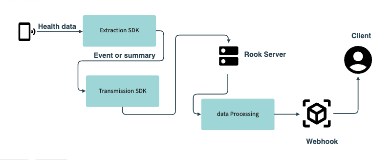 Data is transmitted to the ROOK server, processed, and then sent via webhook to the client.