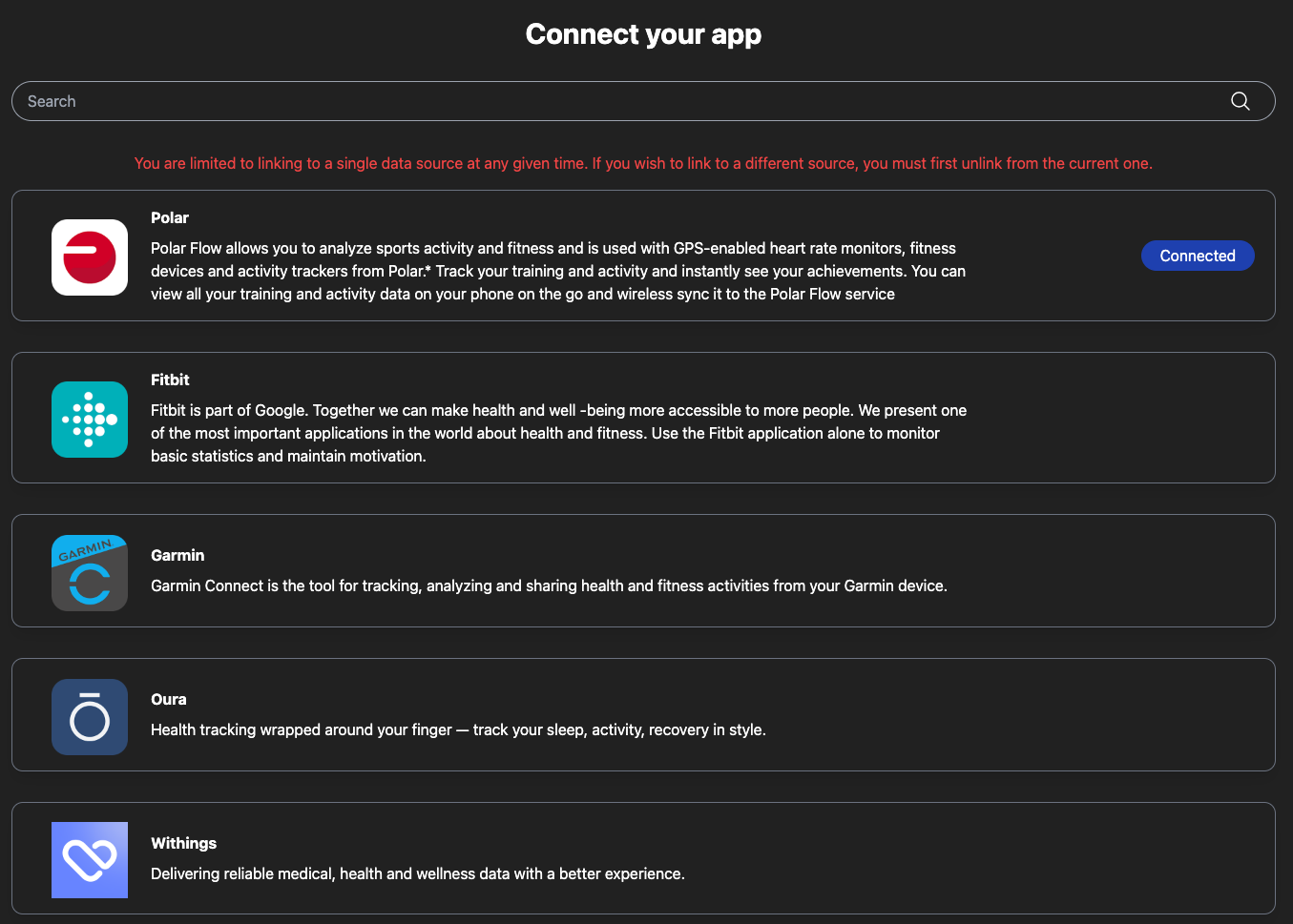 UI Design: Integrate buttons for each health data source on your Connections page, utilizing the returned assets and status indicators from ROOK that's to make the integration with each data source.