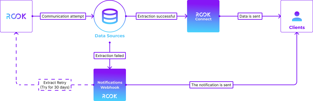 The Notification Webhook add-on enables ROOK to send real-time notifications to clients regarding actions within their integration with us. This feature includes notifications for new user creation, connection or disconnection of data sources, failed notifications to user data sources, and undelivered information alerts. Our aim is to provide clients with timely updates without the need for API queries, leveraging webhooks for automatic notifications. This enhancement ensures that clients receive up-to-date information, streamlining their workflows and improving efficiency. This add-on is available upon request. To access it, contact your account manager.